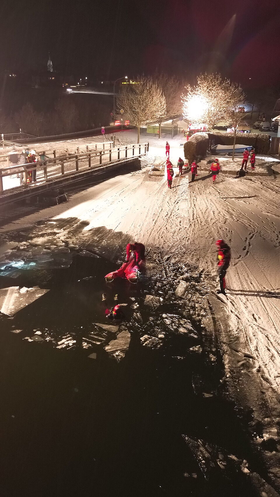 Die Übung stieß auf großes Interesse: Viele Zuschauerinnen und Zuschauer verfolgten das Geschehen von der Brücke aus und konnten beobachten, wie anspruchsvoll und zugleich wichtig Rettungsmaßnahmen auf Eis im Winter sind.