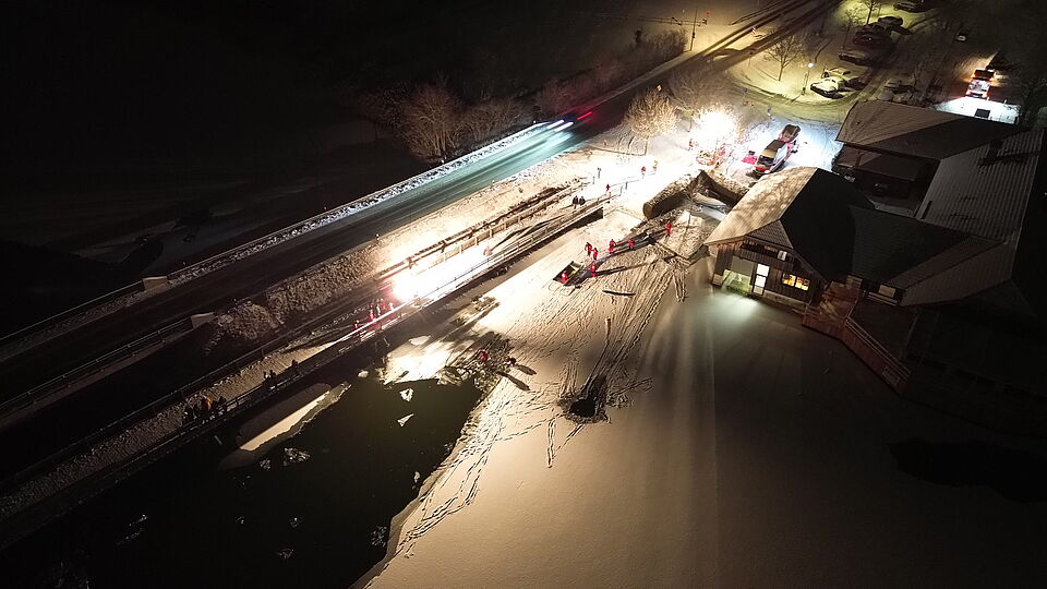 Zu Beginn wurde ein echtes Einsatzszenario simuliert: Eine Person befand sich bereits im Wasser in einem Bereich eingebrochener Eisflächen – unter der Brücke war das Wasser nicht vollständig zugefroren. Nach dem gemeinsamen Eintreffen von mobiler SEG und Feuerwehr stellte sich die mobile SEG Tengling-Törring umgehend einsatzbereit auf: Ausgebildete Wasserretter rüsteten sich mit trockenen Wasserretteranzügen aus und gingen mit einem mobilen Eisrettungsschlitten, der speziell für Einsätze auf Eis und in Eisbruchbereichen konzipiert ist, in die Rettung vor.