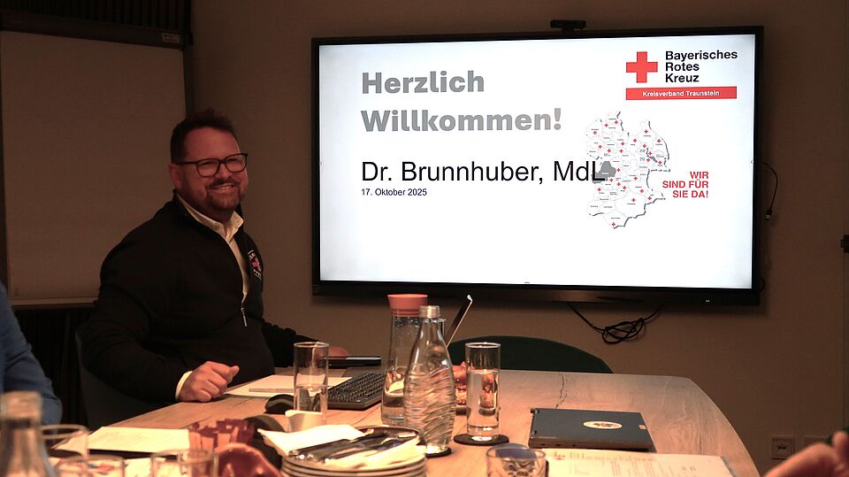 Ein besonderer Fokus lag dabei auf dem Thema Helfergleichstellung, das dem BRK sehr am Herzen liegt. Die Gleichstellung und Anerkennung ehrenamtlicher Helfer (im Vergleich zu Einsatzkräften der Freiwilligen Feuerwehren in Bayern) ist ein wichtiger Schritt, um den Einsatz der zahlreichen freiwilligen Helfer langfristig zu sichern und zu fördern. Zu diesem Zweck wurde Dr. Brunnhuber eine umfassende Präsentation vorgeführt, die die vielfältigen Aufgaben, Initiativen und Unterstützungsangebote des BRK im Landkreis Traunstein vorstellte.