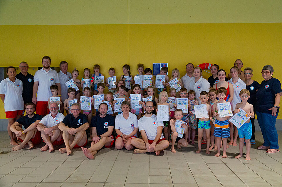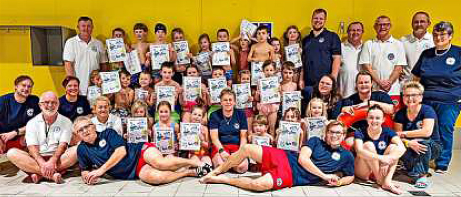 Mit dem vorerst letzten Schwimmkurs vor dem Sommer endete am 31. März für 30 Kinder das Üben im Tachertinger Hallenbad. In zehn Stunden wurden sie an das Element Wasser herangeführt. Mit Hilfsmitteln, wie Poolnudeln, Schwimmbretter und Tauchringen, wurden zahlreiche Übungen durchgeführt. Die Kinder sollen dabei das Springen, das Schweben und Gleiten im Wasser sowie das Untertauchen lernen. Ebenso werden nach sogenannten Wassergewöhnung die Arm- und Beinbewegungen des Brustschwimmens erlernt. Die Koordination zwischen diesen beiden Bewegungen stellt dabei die größte Schwierigkeit dar. Wenn die Kinder all das beherrschen, können sie am letzten Tag des Kurses die Prüfung zum Seepferdchen oder Bobby ablegen. Beim bereits vierten Schwimmkurs in der Wintersaison 2022/2023 erhielten zwölf Kinder das Seepferdchen und zwölf Kinder den Bobby. Die Schwimmtrainer der Ortsgruppe waren sehr stolz auf ihre Schützlinge, und viele Kinder bedankten sich persönlich bei ihren Trainern. Im Anschluss an den offiziellen Teil durfte sich noch jeder Kursteilnehmer aus dem Becken eine Badeente holen. Diese wurden natürlich sofort benutzt, um sich gegenseitig und auch die Schwimmtrainer zu bespritzen. Die Eltern, die beim kompletten Kurs anwesend sein durften, sahen nach der wilden Wasserschlacht in strahlende Kinderaugen.