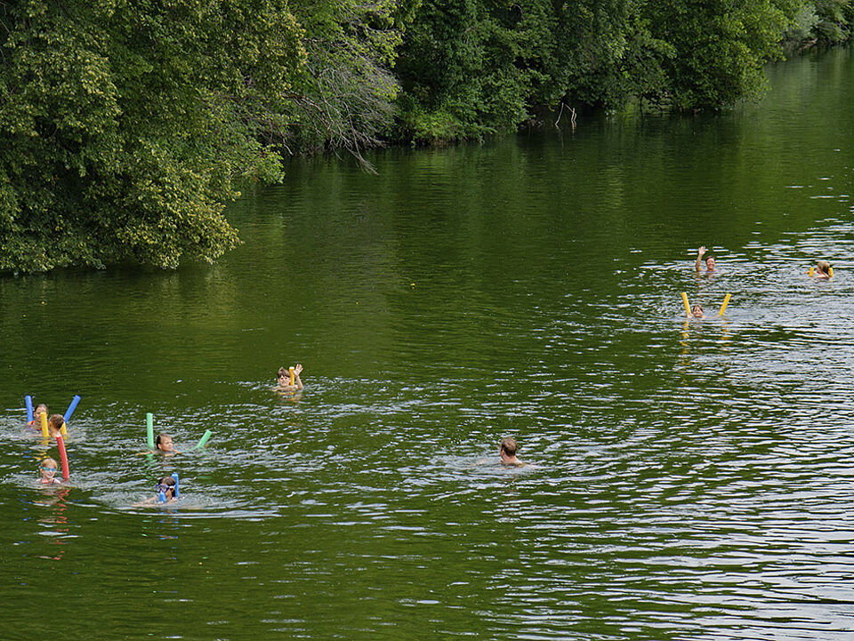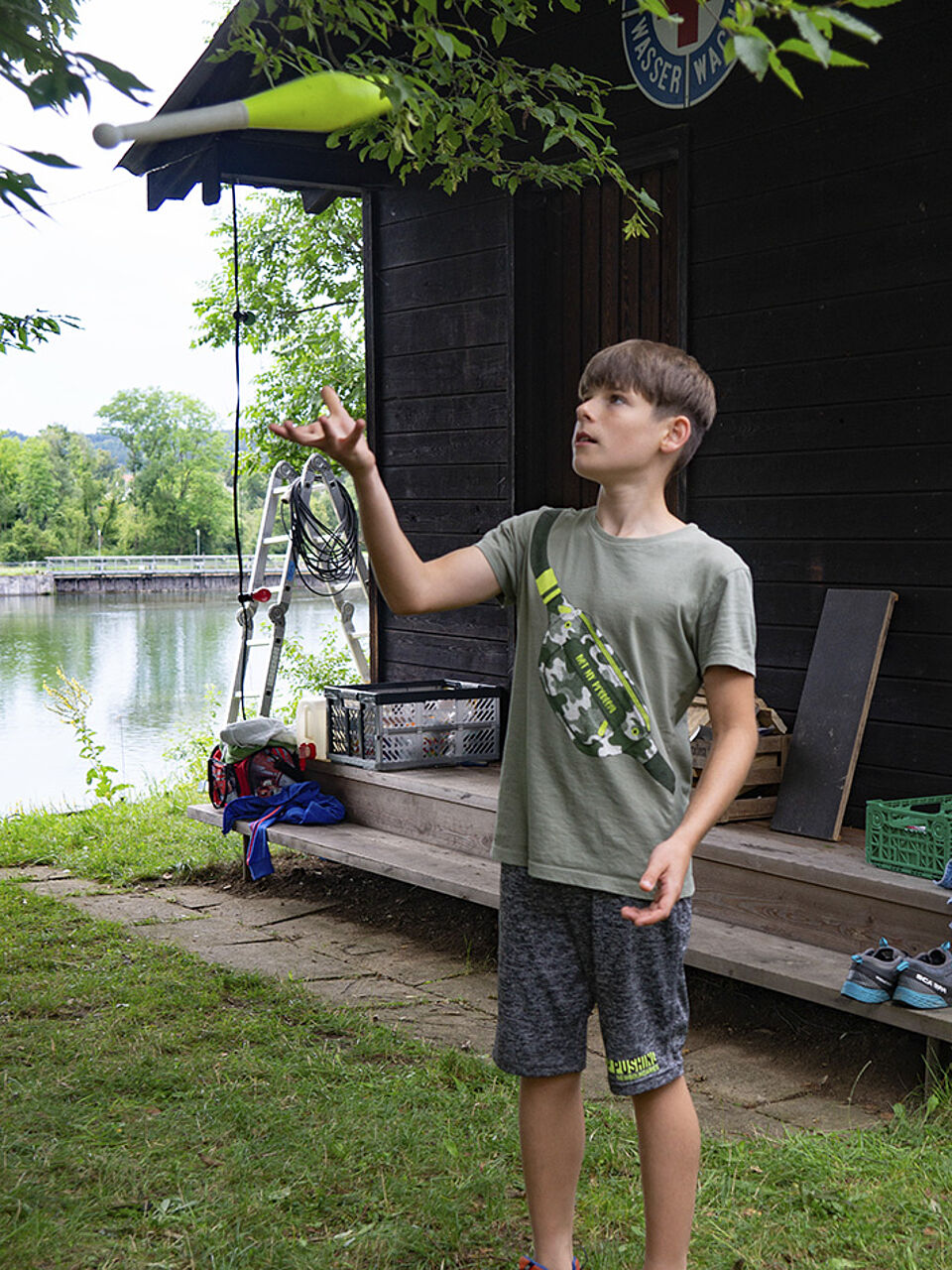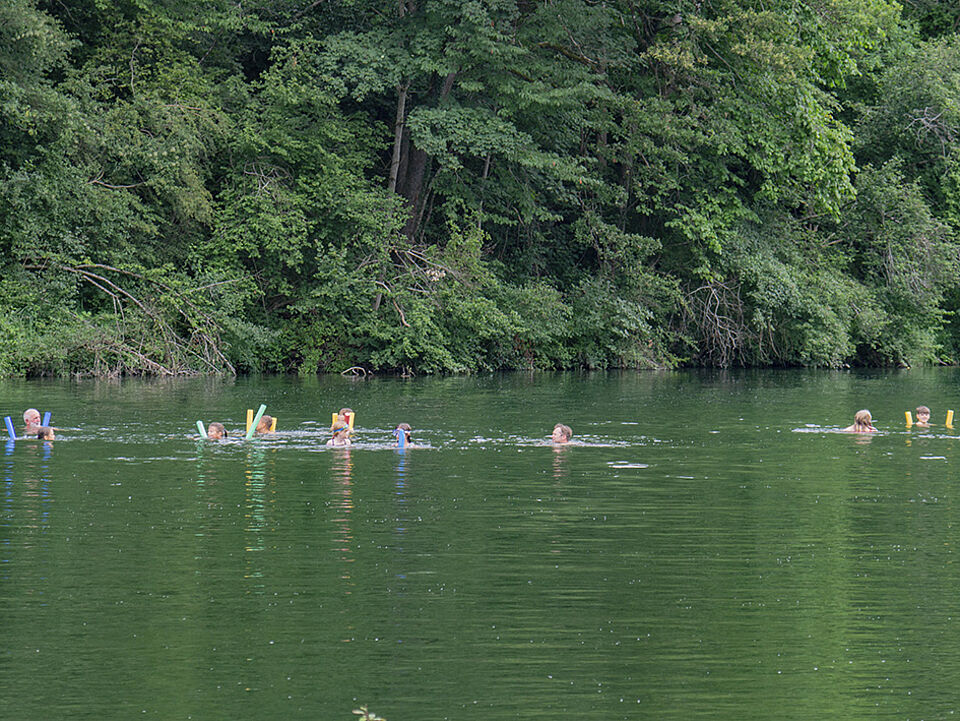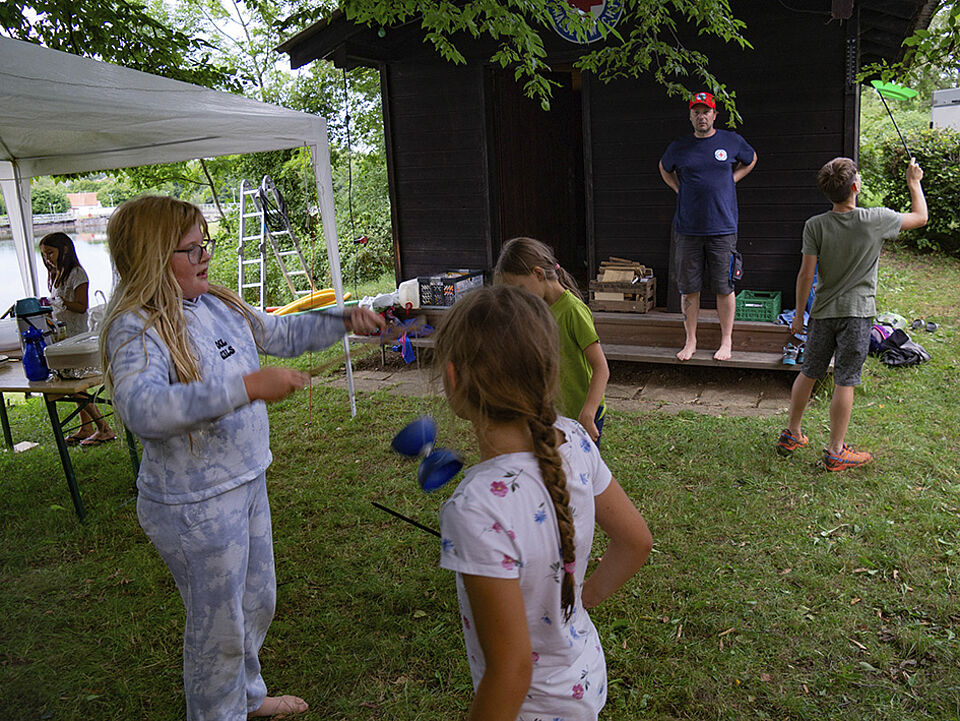Vor allem die Hüpfburg war natürlich die große Attraktion des Nachmittags. Für eine Abkühlung vom Hüpfen sorgte dann die ca. 17 Grad kühle Alz, die mithilfe von Poolnudeln ein Stück hinunter geschwommen wurde. Die dunklen Wolken, die bereits am Himmel zu sehen waren, ließen da schon einige Vorahnungen aufkommen. Und es dauerte nicht lange, bis der Regen aufs Gelände prasselte, sodass alle die bereitstehenden Pavillons aufsuchten. Diese aufgezwungene Ruhepause nutzten die Trainer, um jedem Kind ihren frisch ausgestellten Wasserwachts-Ausweis sowie ihren Schwimmpass mit dem bereits abgelegten bronzenen Schwimmabzeichen zu übergeben. Sie bedankten sich für die rege Trainingsteilnahme und gaben einen kurzen Ausblick auf die weiteren Trainingsstunden ab September. Auch Vorstand Franz Oberleitner fand positive Worte für die Jugend. Sie sollen weiter so fleissig trainieren und sich viel Wissen aneignen, um in ein paar Jahren die Aktiven unterstützen zu können.