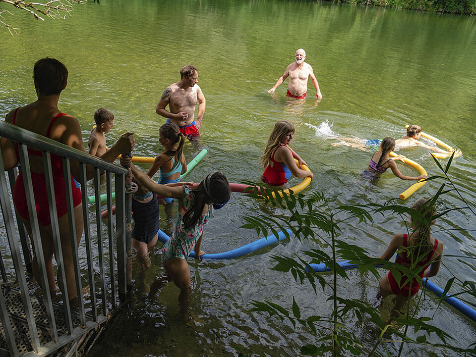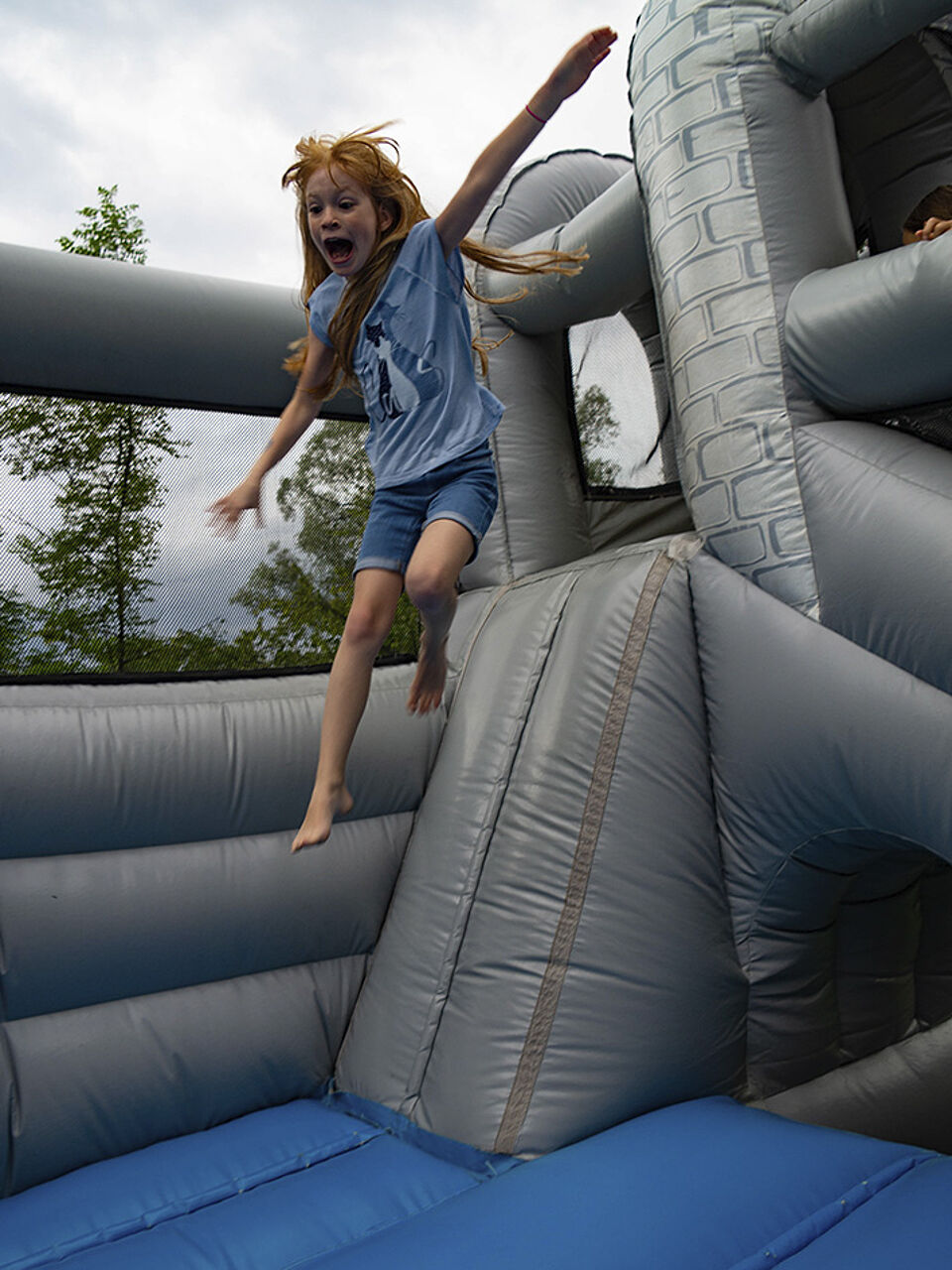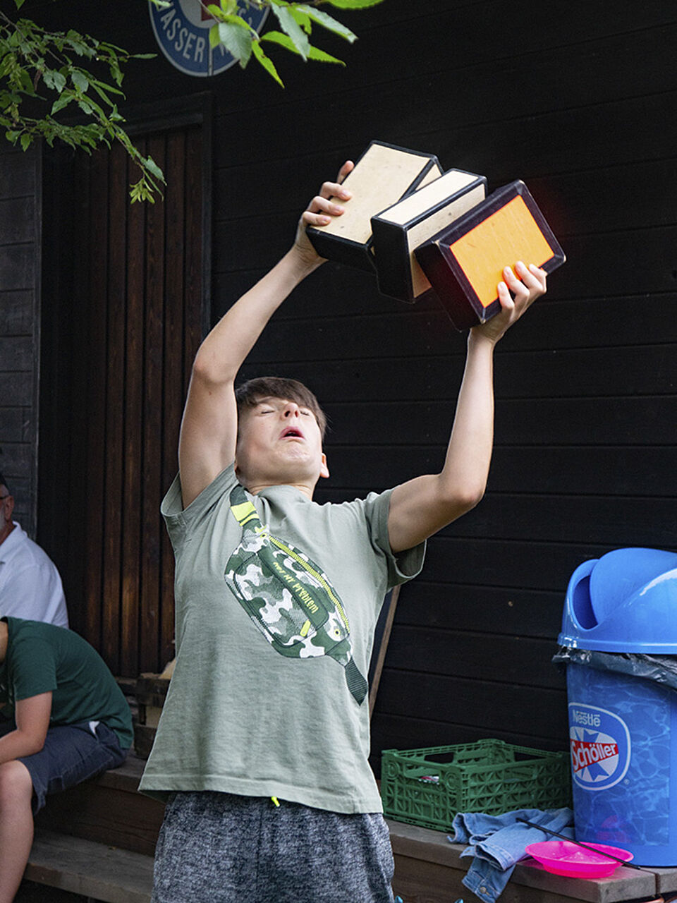Vor allem die Hüpfburg war natürlich die große Attraktion des Nachmittags. Für eine Abkühlung vom Hüpfen sorgte dann die ca. 17 Grad kühle Alz, die mithilfe von Poolnudeln ein Stück hinunter geschwommen wurde. Die dunklen Wolken, die bereits am Himmel zu sehen waren, ließen da schon einige Vorahnungen aufkommen. Und es dauerte nicht lange, bis der Regen aufs Gelände prasselte, sodass alle die bereitstehenden Pavillons aufsuchten. Diese aufgezwungene Ruhepause nutzten die Trainer, um jedem Kind ihren frisch ausgestellten Wasserwachts-Ausweis sowie ihren Schwimmpass mit dem bereits abgelegten bronzenen Schwimmabzeichen zu übergeben. Sie bedankten sich für die rege Trainingsteilnahme und gaben einen kurzen Ausblick auf die weiteren Trainingsstunden ab September. Auch Vorstand Franz Oberleitner fand positive Worte für die Jugend. Sie sollen weiter so fleissig trainieren und sich viel Wissen aneignen, um in ein paar Jahren die Aktiven unterstützen zu können.