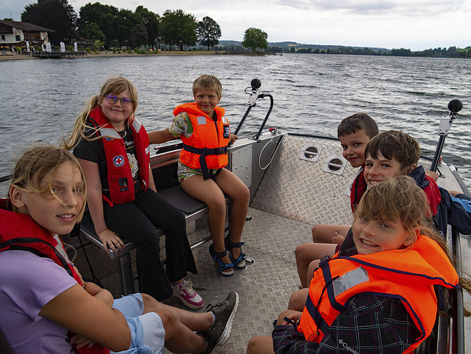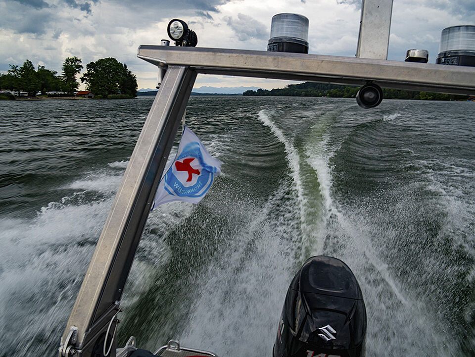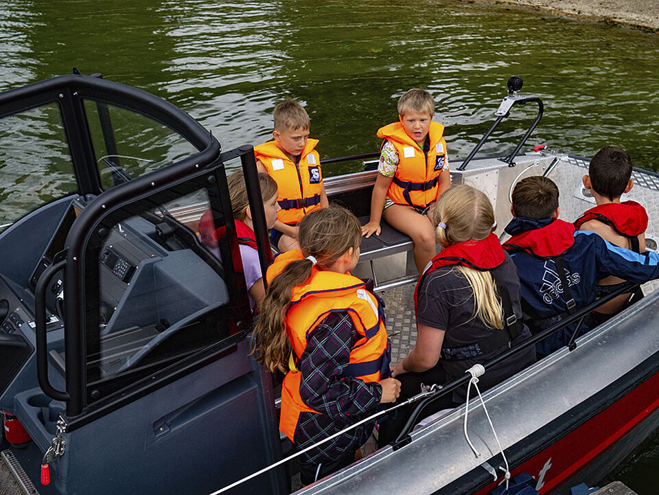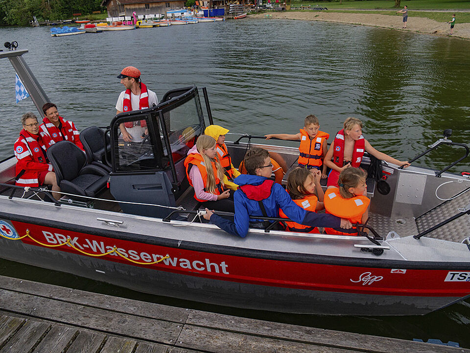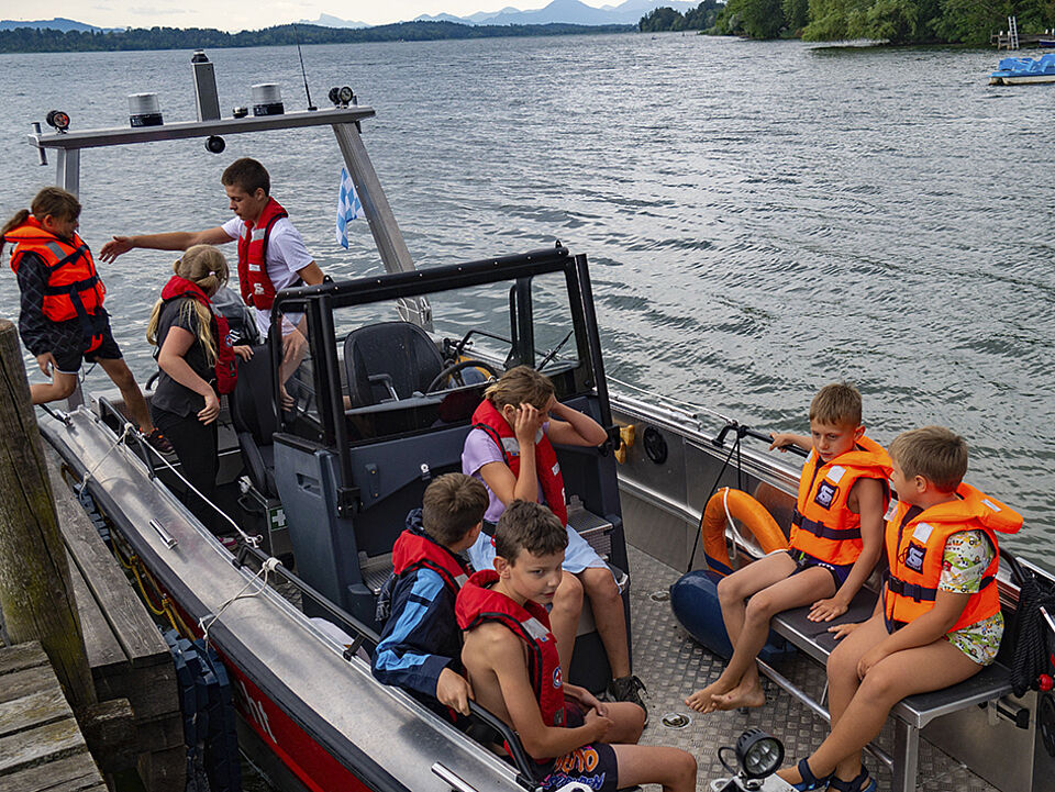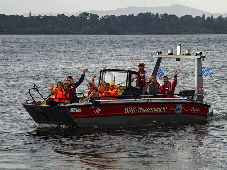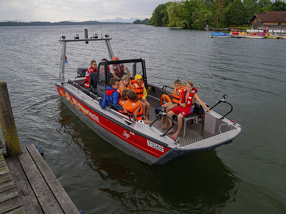 Nach einer kurzen Begrüßung und dem Anziehen der Schwimmwesten wurde das Boot „Sepp“ unter großen Augen der Kinder auch schon zu Wasser gelassen. In zwei Gruppen ging es dann mit Bootsführer Alois Maier einmal quer über den Waginger See. Dabei wurde den Kindern auch das Feuerwehr- und Polizeiboot gezeigt, die am Strandbad bei der Segelschule ankern. Auf der Fahrt konnte der See einmal aus einer ganz anderen Perspektive gesehen werden und die Geschwindigkeit von ca. 50 km/h tat ihr übriges, dass jeder Tachertinger Wasserwachtler, ob Groß oder Klein, restlos begeistert war.