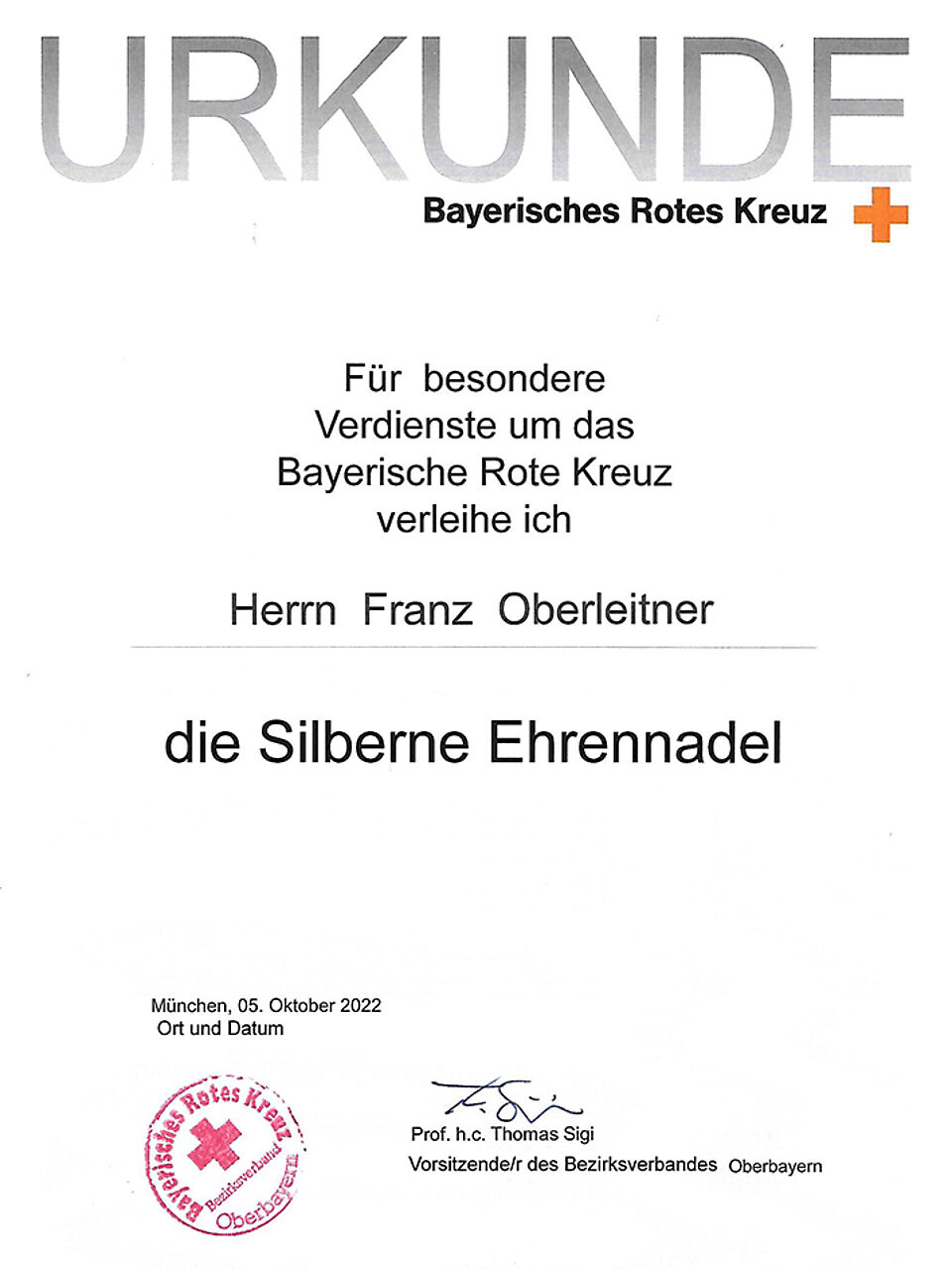 Bereits am 05.10.2022 wurde unser Vorstand Franz Oberleitner stellvertretend für die gesamte Ortsgruppe geehrt. Vom Bezirksverband Oberbayern des Bayerischen Roten Kreuzes erhielt Franz in Traunstein die „Silberne Ehrennadel“ für besondere Verdienste um das Bayerische Rote Kreuz. Diese waren die Durchführung der zahlreichen Schwimmkurse sowie sein Einsatz für unser neues Hallenbad.