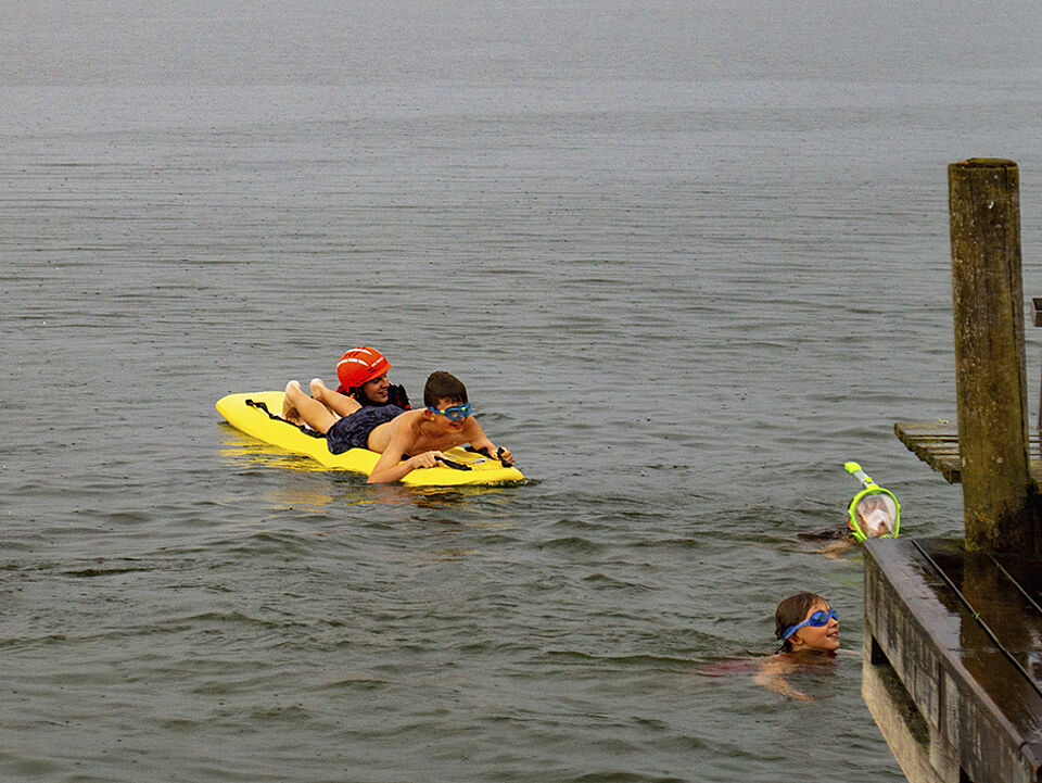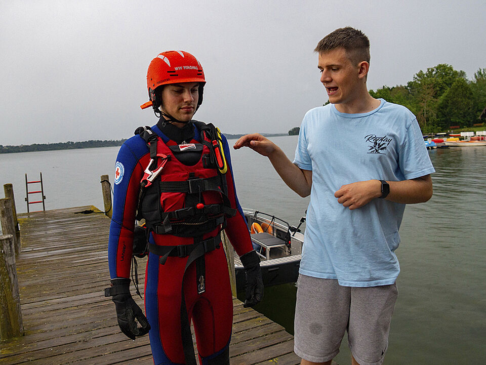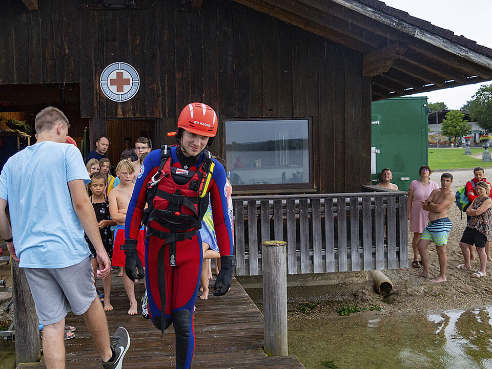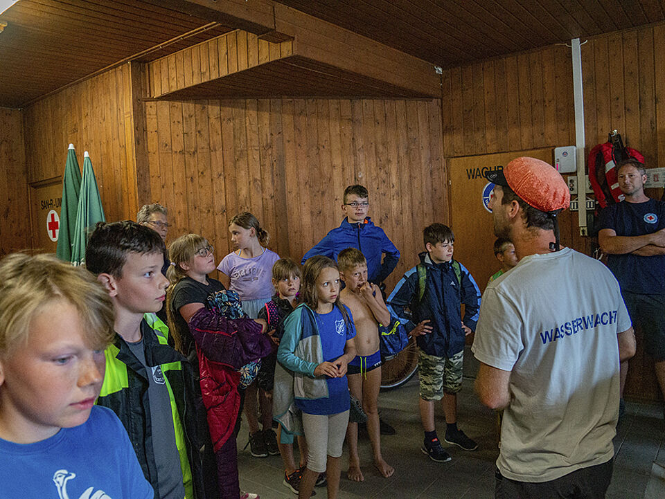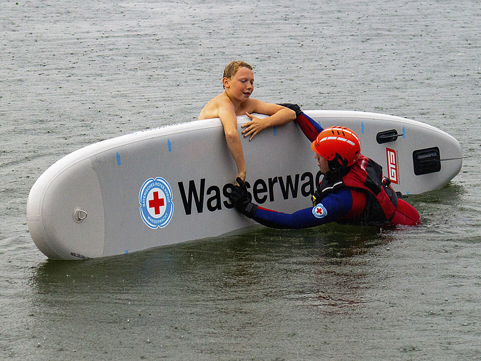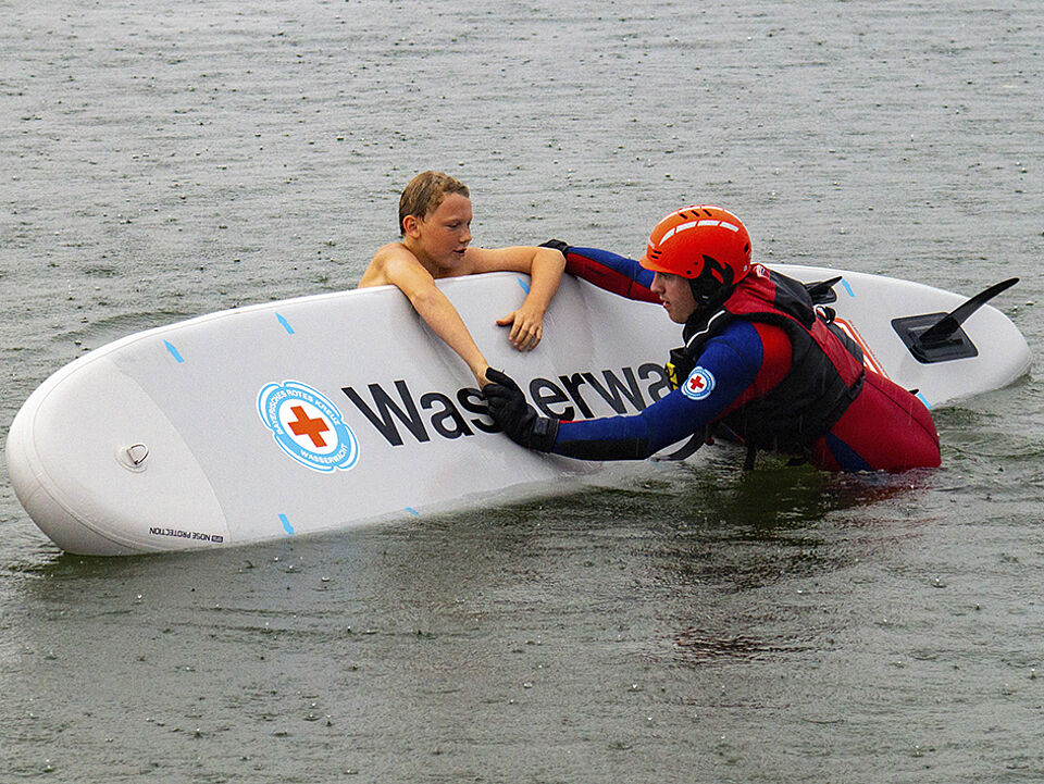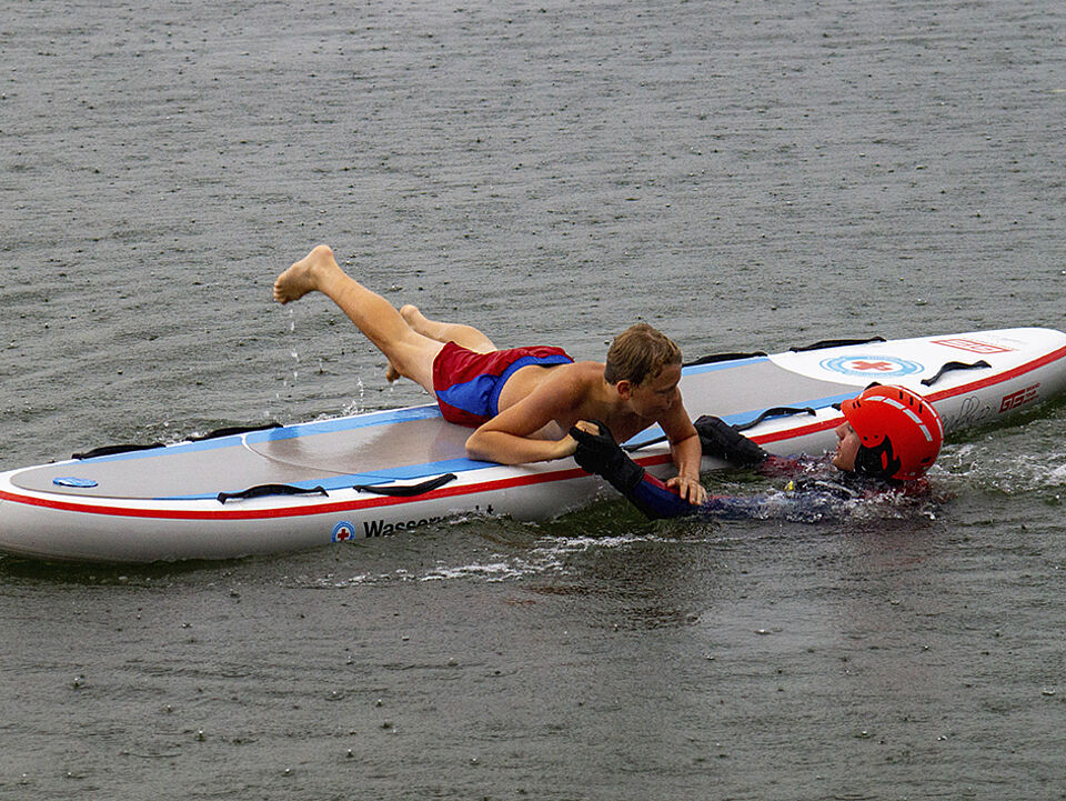 Beim Bootfahren allein blieb es an diesem Tag allerdings nicht. Zurück am Ufer galt es dann, die anderen Rettungsmittel der Wasserwacht wie SUP und Rettungsbrett genauer unter die Lupe zu nehmen. Und von den angehenden Wasserrettern im Wasserrettungsdienst Simon und Korbinian erhielten die Kinder einen kurzen Einblick in deren Ausrüstung und Aufgaben. Als dann anschließend alle Kinder ins Wasser gingen, konnte sich jeder noch mit dem SUP von Wasserretter Simon „retten“ lassen.