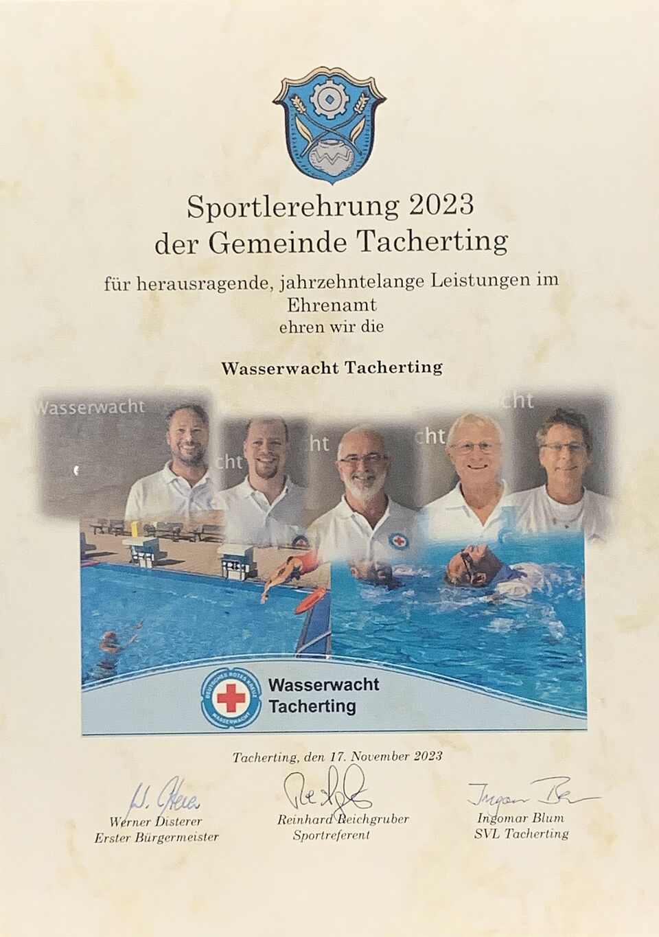 Im Rahmen der Sportler-Ehrung der Gemeinde Tacherting wurde auch unsere Wasserwacht im Saal des „Kirchenwirtes“ ausgezeichnet. Gewürdigt wurden wir für unser Engagement beim Betrieb und Aufsicht im Tachertinger Hallenbad und für die Durchführung vieler Schwimmkurse. Unser Vorstand Franz Oberleitner nahm die Glückwünsche vom 1. Bürgermeister Werner Disterer entgegen.