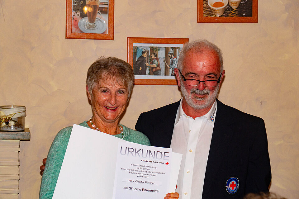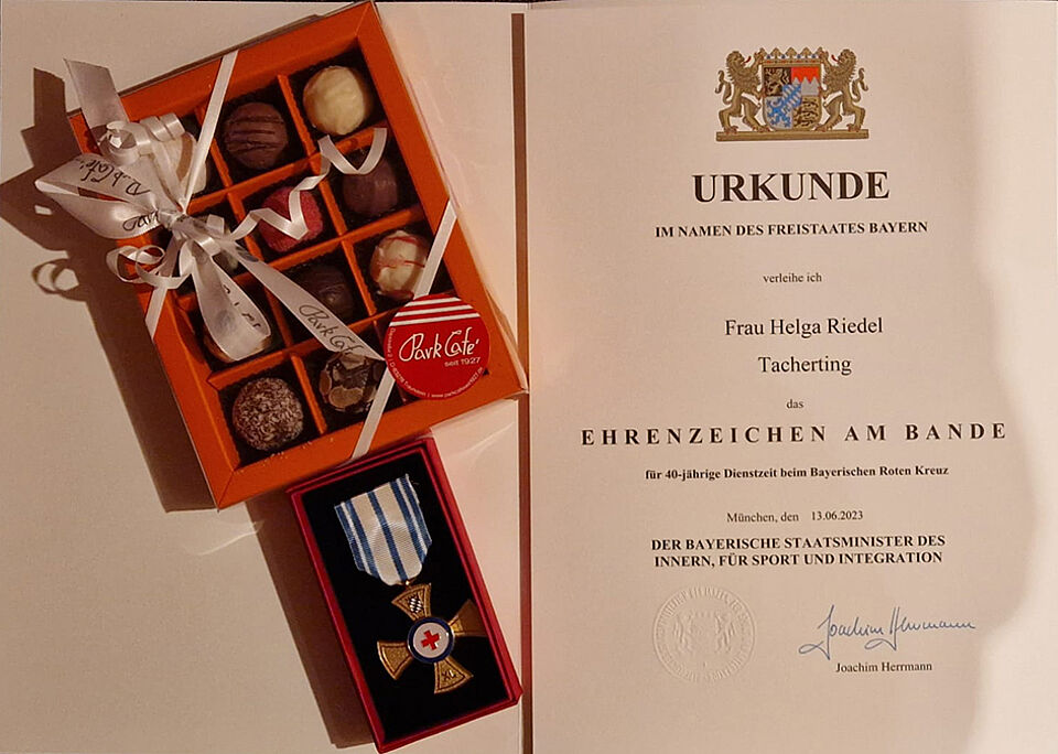 Helga Riedel, Jugendleiterin unserer Ortsgruppe wurde an diesem Abend ebenfalls geehrt. Helga erhielt von Siegfried Walch in Vertretung für Bundespräsident Frank-Walter Steinmeier das Ehrenzeichen am Band erster Klasse für 40 Jahre aktive Dienstzeit beim BRK.
