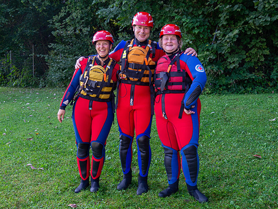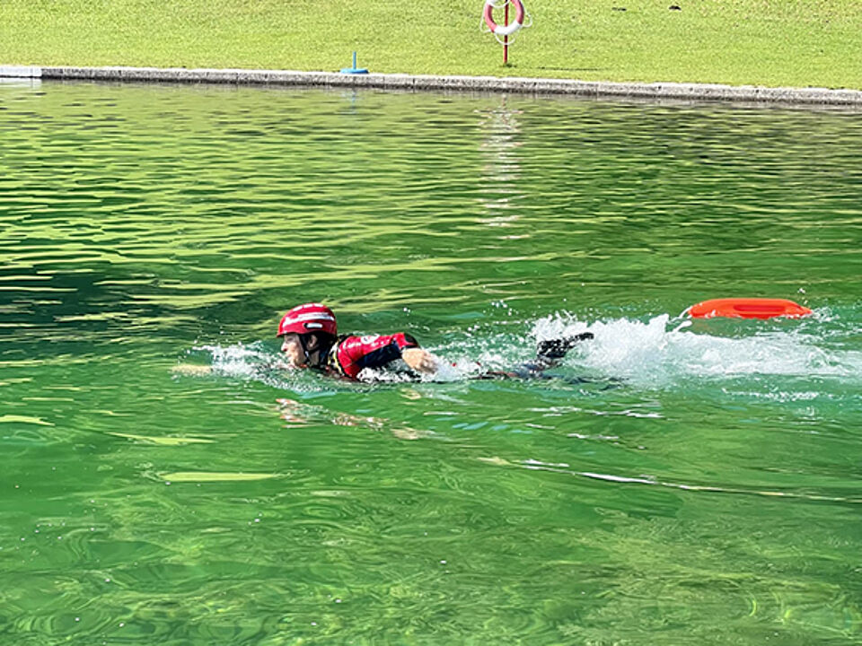 Ein weiterer Schwerpunkt des Kurses lag auf der Suche, Rettung und Erstversorgung bei einem Ertrinkungsunfall. Hierbei trainierten die Teilnehmer das Schwimmen mit der persönlichen Schutzausrüstung (PSA Nass) sowie der ABC-Ausrüstung. Diese beinhaltet Neoprenanzug, Schwimmweste, Helm, Handschuhe, Schuhe, Taucherbrille, Schnorchel und Flossen. Des Weiteren wurde mit verschiedenen Rettungsgeräten geübt. Das Bergen von Verletzten aus dem Wasser und das effektive Handeln in Notfallsituationen wurde ebenfalls intensiv trainiert.
