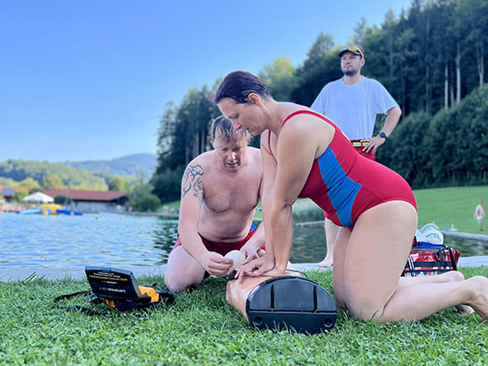 Neben einer schriftlichen Prüfung galt es, im Anschluss dann noch eine praktische Prüfung abzulegen. Bei noch schön warmen Temperaturen und unter den Augen vieler Badegäste mussten Xenia Kettl, Lena und Werner Eder jeweils einen „Ertrinkenden“ vom Boden des 2,80 m tiefen Natur-Beckens hochziehen und sich anschließend aus der Umklammerung des Ertrinkenden befreien. Mit einem Fesselschleppgriff wurde der Verunfallte dann zu den Helfern gebracht, wo er mit Hilfe eines Spineboards vom Wasser auf den Steg gezogen wurde. Im Anschluss musste dann in Zweihelfer-Methode an einer Reanimationspuppe die komplette HLW mit Beatmungsbeutel und AED durchgeführt werden, ehe man endlich die begehrte Urkunde in den Händen halten konnte.