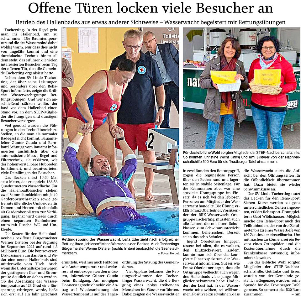Am 19.11.2022 fand der Tag der offenen Tür im Hallenbad Tacherting statt. Die Ortsgruppe Tacherting führte zu jeder vollen Stunde Rettungsübungen durch. Auch die Jugend war beteiligt und zeigte ihr Können mit Schwimmübungen.